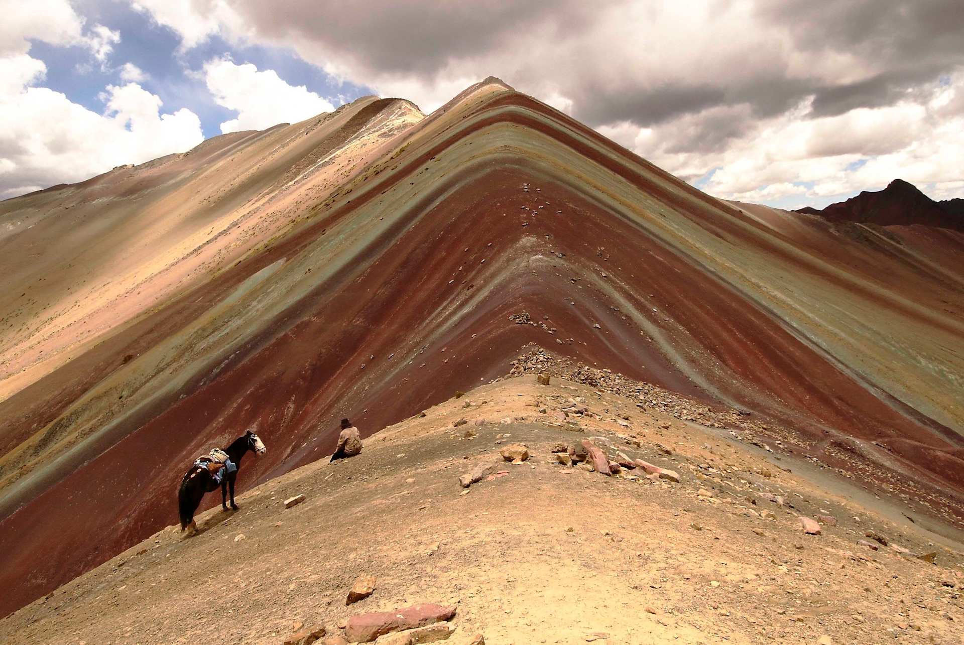 The beautiful colored striations of Rainbow Mountain in Peru's Andes are a spectacular sight. 62 miles from Cusco and standing at 16,000 feet above sea level, the mountain considered a holy site in Peru can be visited by foot, mountain bike or horseback.