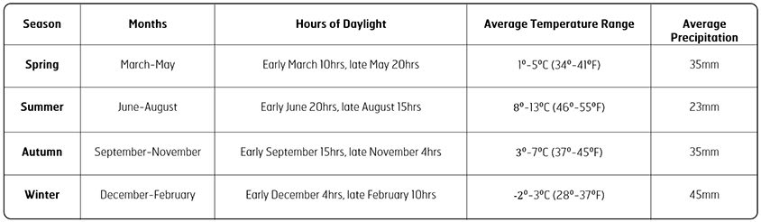The seasons in Iceland follow the norm for the Northern Hemisphere, and so spring is generally considered to be March, April and May. Weather conditions are still pretty chilly, although with the right gear these months can be a great time to get out hiking whilst there are a few less tourists on the more popular routes. Temperatures during spring average 1⁰-5⁰C (34⁰-41⁰F), with an average monthly rainfall of around 35mm.