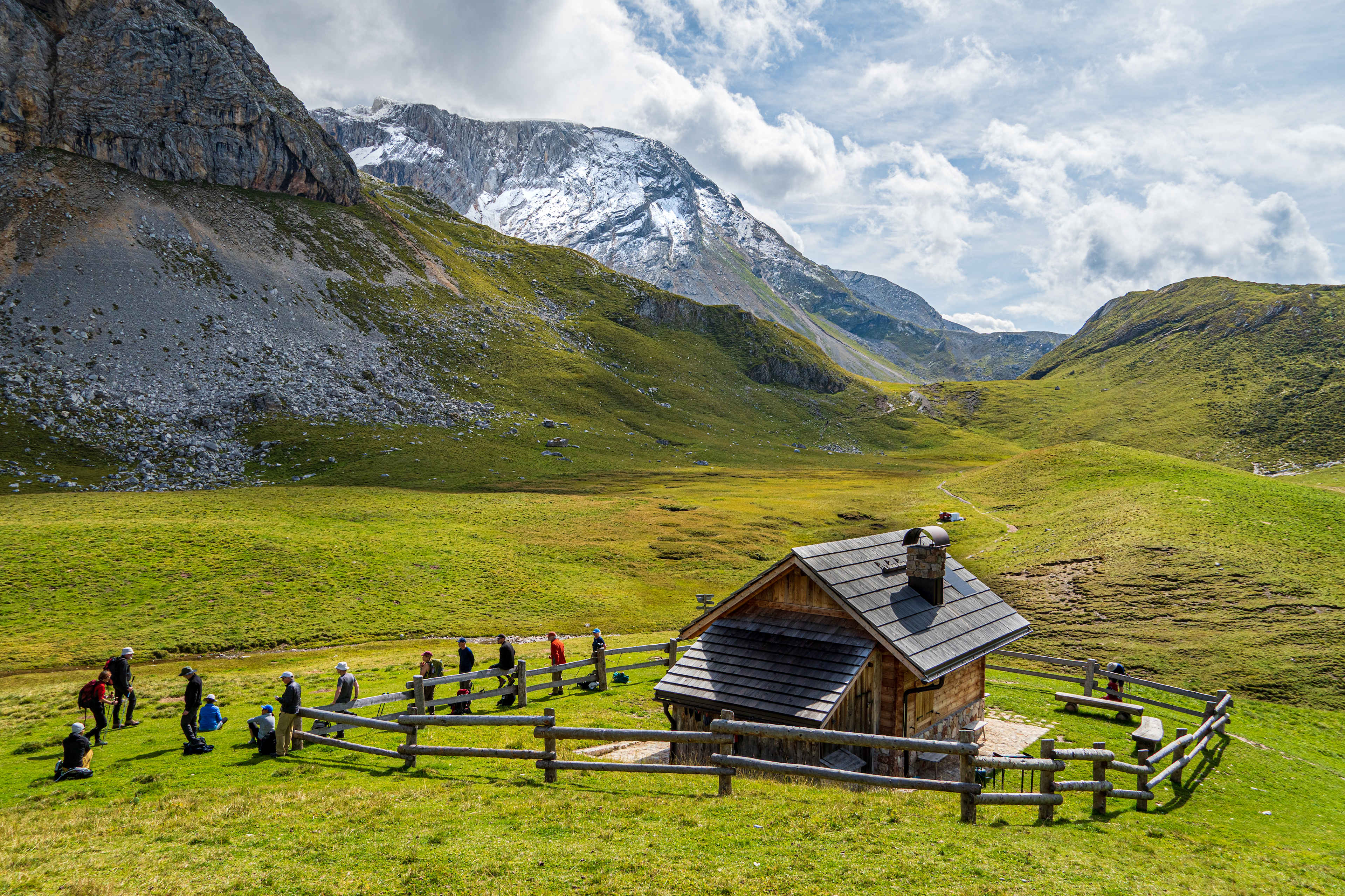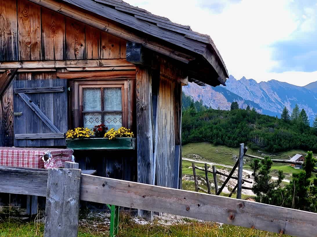 When we reach Lake Lé Piciodel we'll be hiking through a landscape studded with little lakes and rounded mountain tops along the Ru d'Al Plan River. Continuing to follow the trail toward Lago di Limo, we’ll arrive at Rifugio Fanes (2,060m / 6,759'), the perfect lunch stop. From Rifugio Fanes, we’ll continue to hike south on gentle curves out of a steep valley to Passo di Limo (2,172m / 7,126'), past an old military building and a wooden cross, hiking down for Malga Fanes Grande (2,104m / 6,903') a cheery converted farm. The route continues through the beautiful high meadow and karst formations and then descends to Capanna Alpina (1,726m / 5,663'), a restaurant built at the edge of the Natural Park in an incredible setting.